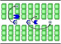 Aisle interference: A passenger (2A) tries to reach his seat further down the aisle (2B) but is obstructed by other passengers trying to find their seats or stow their luggage