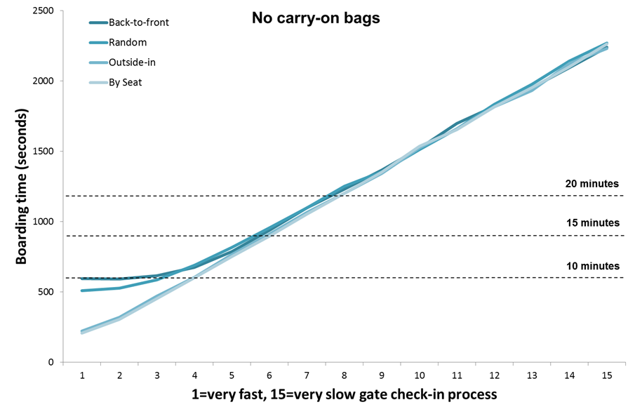 Analytical and simulation results show that group/zone boarding can speed up the airplane boarding process. Airlines use a number of different group/zone boarding systems or boarding rules, the idea (there are numerous variations) of some of them, are shown below. By pressing play you can view a simulation of different airplane boarding strategies. Note, random boarding (i.e. boarding all rows at the same time) is faster than back-to-front boarding. Hence, you will actually speed up the boarding process if you board before your turn in back-to-front boarding. Try and explain that to your boarding agent :) See comparison study for a summary of results.
